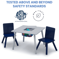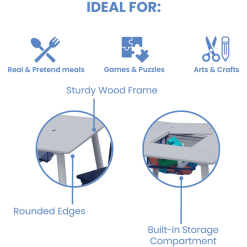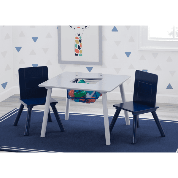 consta de una robusta mesa con almacenaje en el centro y dos sillas a juego.