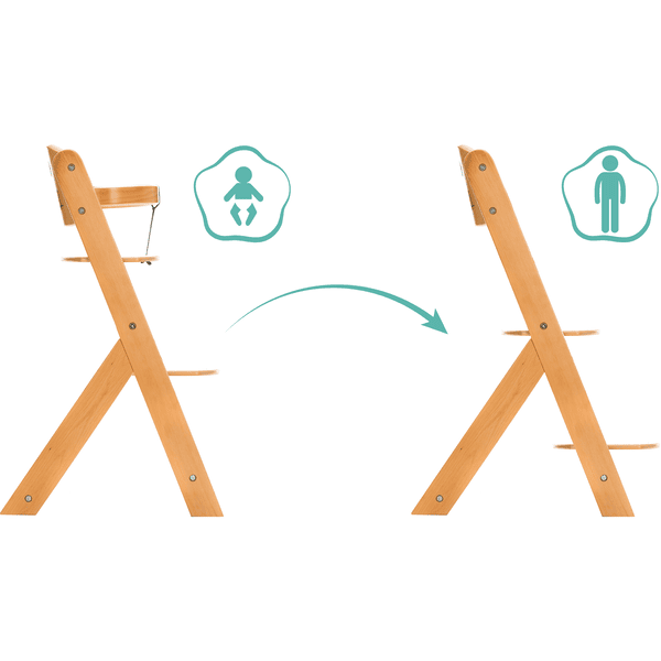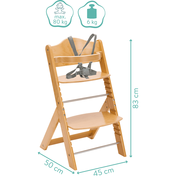 El estribo permite mayor sujeción a los niños pequeños y se puede extraer para los niños más grandes. Fabricada en sólida madera, lo que la hace muy estable.