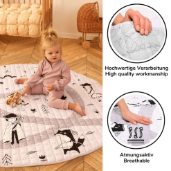 - La alfombra de juego está fabricada con un tejido de poliéster suave y respetuoso con la piel. La alfombra de gateo cumple con las normas REACH y también con todas las normas de seguridad de productos de la UE.