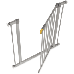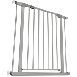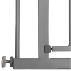 El Metal lgitter puede ser sujetado con seguridad entre los marcos de las puertas, paredes o escaleras por medio de tornillos de fijaci贸n. No tiene que ser perforado. Para pasar, los adultos pueden abrir la puerta en ambas direcciones con una sola mano. Esto deja la otra mano libre para peque帽os tesoros o bolsas de compras. El Stop N Safe 2 tiene un mecanismo de cierre manual con un doble bloqueo de seguridad, que impide la apertura incontrolada por parte de los ni帽os. Con las extensiones disponibles por separado de 9 cm o 21 cm, la barrera puede extenderse de manera flexible hasta 122 cm. Para las barandillas de escaleras redondas, recomendamos los husillos en Y adicionales, que se montan en un lado en lugar de los tornillos de fijaci贸n.