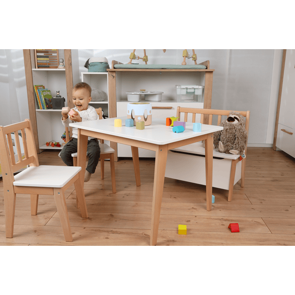 - Material estructura (mesa, silla, banco): haya maciza, lacado