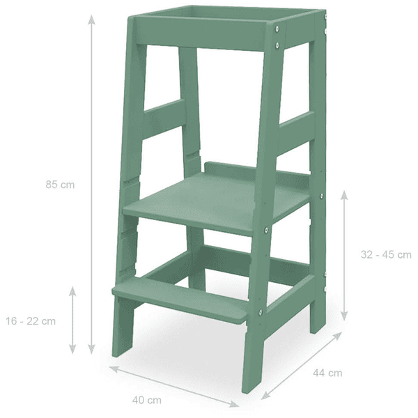 La torre de aprendizaje Pinolino Fino puede ajustarse de forma óptima al tamaño de su hijo en tan solo unos pasos. Como ayuda práctica en la vida diaria con un niño, la torre de aprendizaje ofrece una bipedestación especialmente segura. Con una capacidad de carga de hasta 60 kg, la torre de aprendizaje Fino es el compañero perfecto para la adolescencia. La torre de aprendizaje Fino ha sido diseñada para que su hijo pueda estar más cerca de usted cuando esté trabajando en la cocina o en la mesa y así experimentar las interacciones sociales a una edad temprana y aprender de usted. Al ayudarle a cocinar u hornear, el niño puede crear un vínculo aún más estrecho y desarrollar mejores habilidades lingüísticas y sociales.