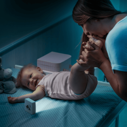 Un recién nacido cambia mucho en la vida cotidiana de su familia. El comportamiento de sueño del bebé determina sobre todo el ritmo nocturno. Para evitar perturbar innecesariamente el sueño del bebé al cambiar pañales por la noche, no debe cambiarse bajo la luz de la habitación. Una luz suave ayuda a preservar el estado de ánimo nocturno y aún así ser capaz de reconocer bien todos los utensilios de cambio necesarios, para que todos puedan volver a un sueño reparador.