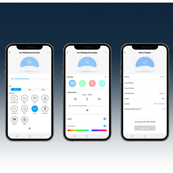- Programación: programación de modos personales (hora, color de la luz, selección de sonido y volumen) que se reproducen automáticamente cada dÃa (por ejemplo, rutina de despertador con luz y sonidos suaves).