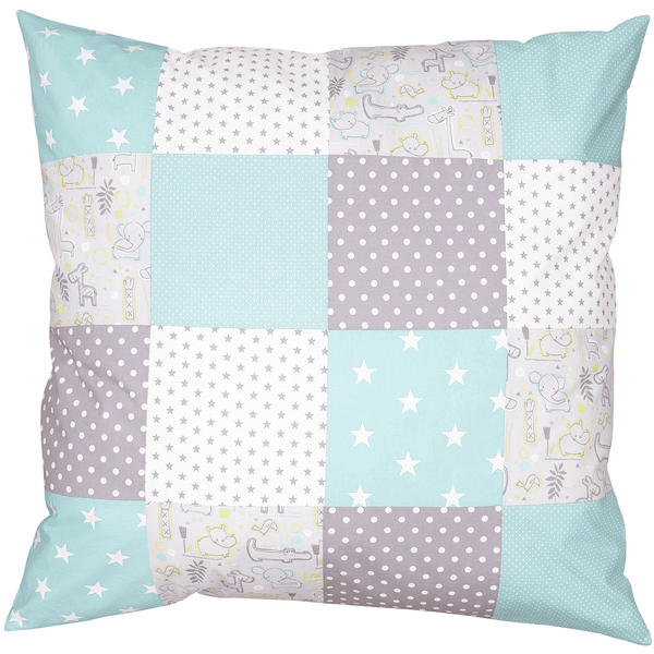 La parte trasera de la funda del cojĂn decorativo está salpicada de un color, mientras que la parte delantera consta de 16 parches de motivos diferentes. Estos parches individuales se unen a mano y con gran cuidado.