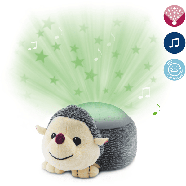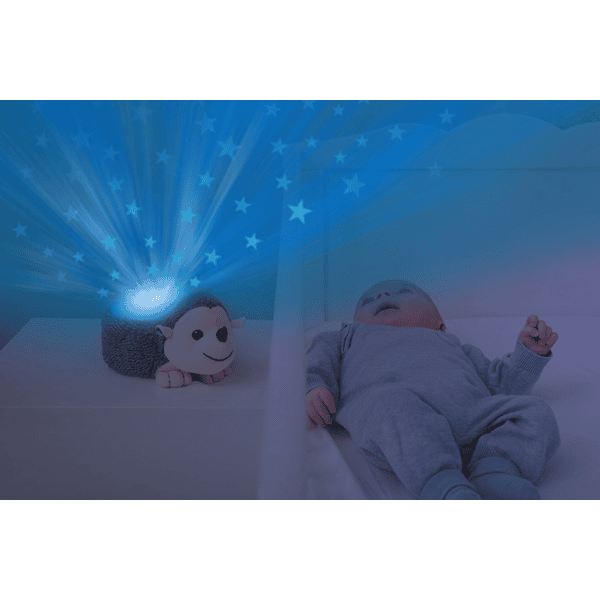 Dulce erizo de felpa Harry con un proyector de estrellas en la espalda evoca un mágico cielo estrellado en el techo. Para las proyecciones de estrellas se puede elegir entre tres colores o colores alternados. Los latidos del corazón, el ruido o la música de salón se pueden seleccionar entre los sonidos relajantes. Después de aprox. 30 minutos la luz se apaga automáticamente y después de aprox. 15 minutos el sonido se apaga automáticamente. Cuando se activa el sensor de sonido, la luz se enciende de nuevo cuando el bebé está llorando. Harry funciona con pilas. Se necesitan tres pilas AA. Las pilas no se incluyen en el envío. Harry el Erizo es adecuado desde el nacimiento.